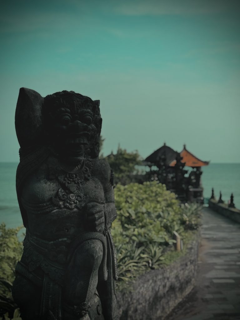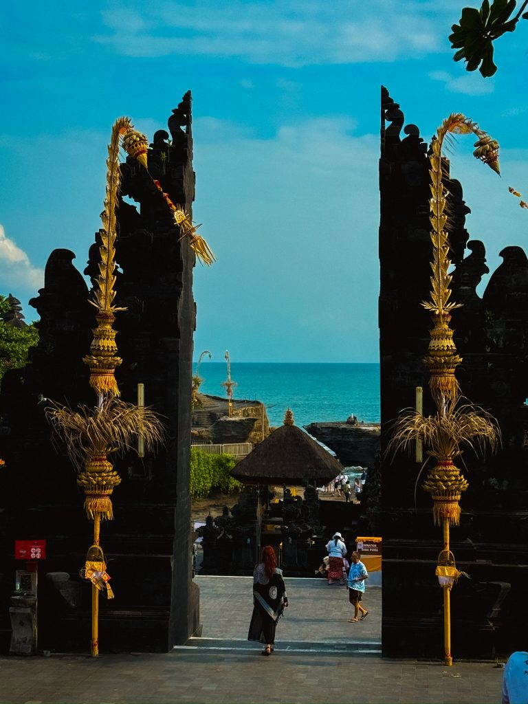 Wir fuhren von Seminyak also mit einem Gojek nach Tanah Lot. Es geht dort erst einmal sehr touristisch los mit vielen Einkaufsmöglichkeiten und einem Schalter für den wenigen Eintritt. Auch die Restaurants innerhalb des Tempelgebietes zeigen, dass die schönen religiösen Tempel nur noch für die Touristen genutzt werden. Wir haben von einem Einheimischen erfahren, dass die großen, öffentlichen Tempel meist nur von den Touristen genutzt werden, zum Beten haben die Familien ihre eigenen Tempel zuhause oder nutzen kleine Tempel des jeweiligen Dorfes/der jeweiligen Stadt.